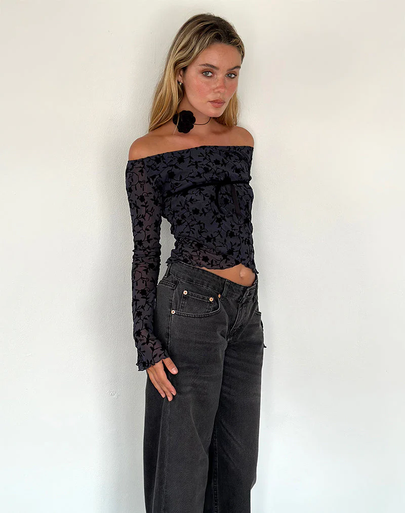 Kareena Long Sleeve Bardot Top in Pretty Petal Flock Navy