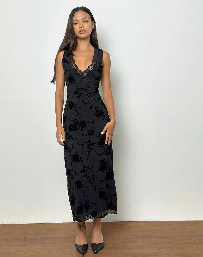 Our Saga midi dress, is complete in a black rose floral flocked fabric. Featuring a sleeveless design, plunge neckline and lace trim. Finished with a lettuce hem.