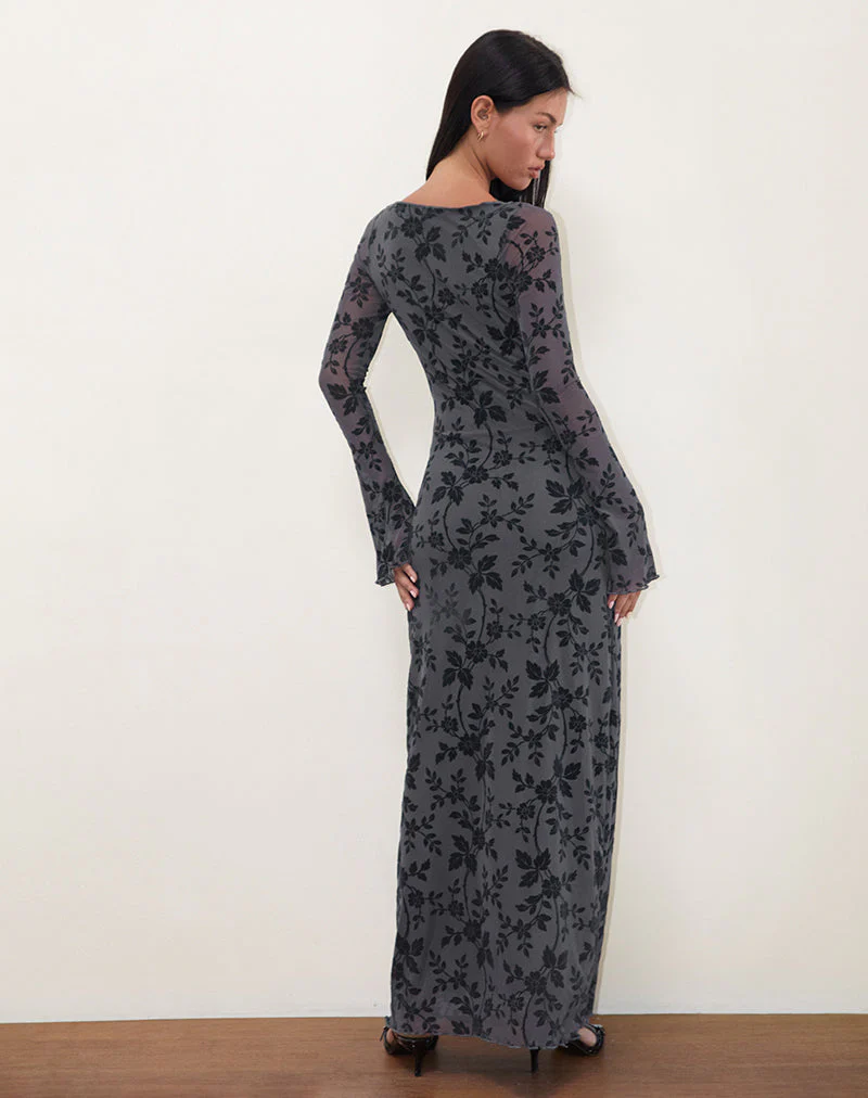 In a grey ocean storm flocked mesh material, the Slokya displays long sleeves, a boat neckline and maxi length. Complete with an all over black floral flock pattern.