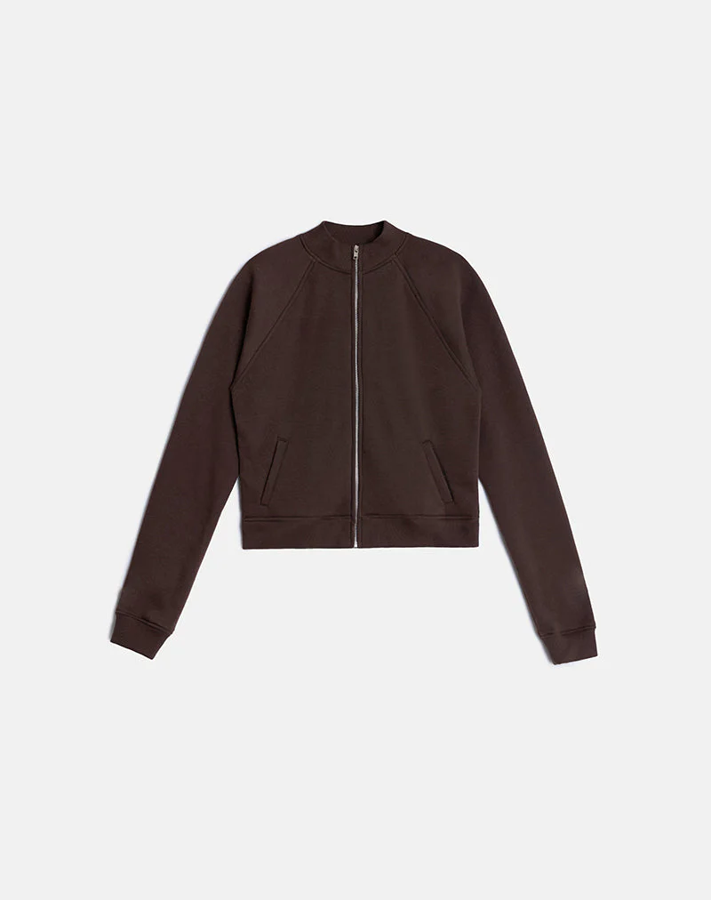 In a bitter chocolate brown fleece fabric, the Tamayo jumper features a zip up design and turtleneck collar. Styled with the Nala trousers in truffle.